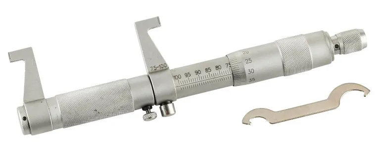Sisämikrometri 75-100 mm mattakromatulla viimeistelyllä. Mikrometrissä tuntoräikkä (kitkakytkin) ja karan lukitusvipu erinomaisen tarkkaa mittaustulosta varten.