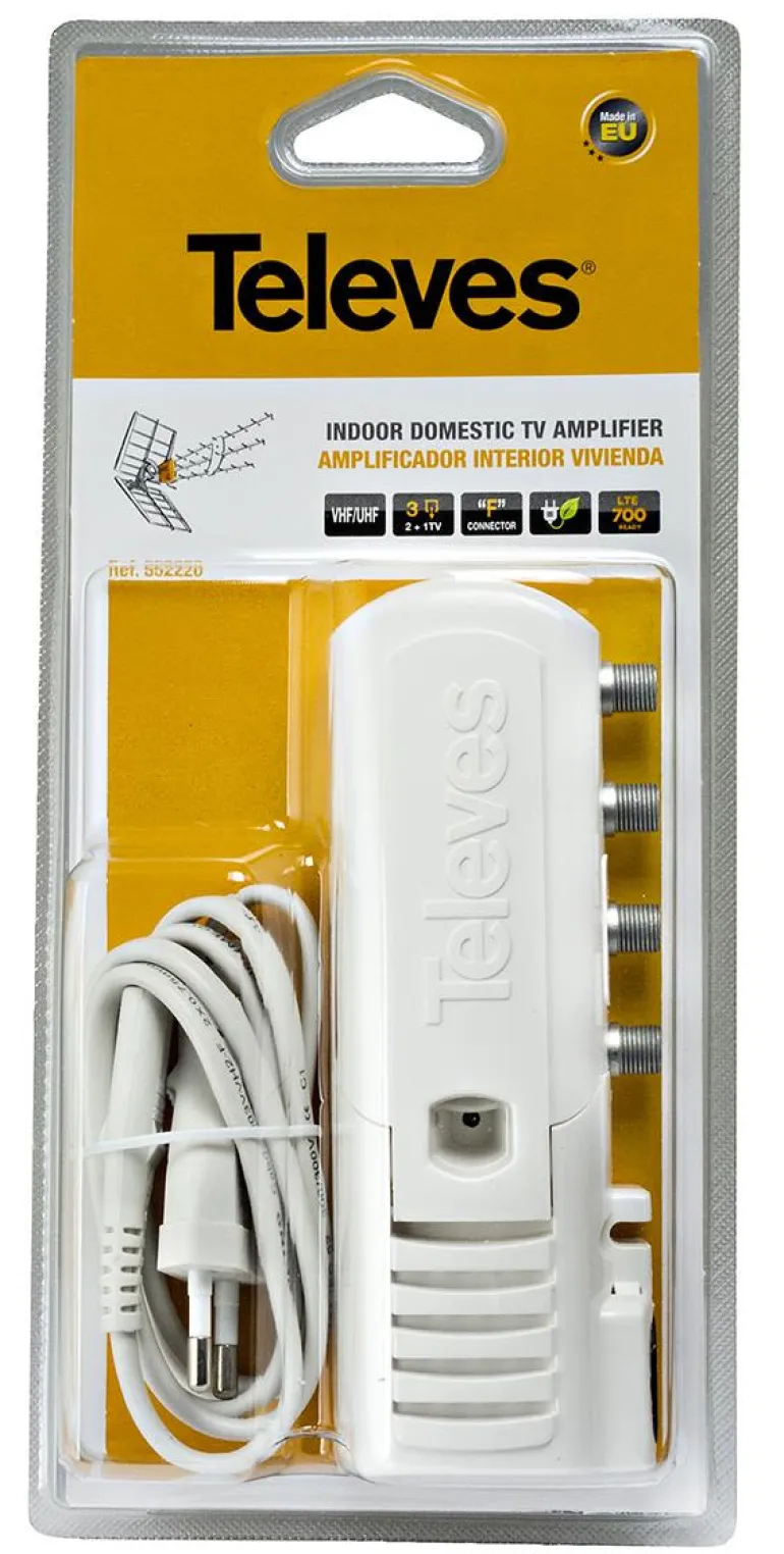 Televes 552220 on 20 dB:n sisävahvistin, jossa on 3 lähtöä TV-verkon laajentamiseen huvilassa/huoneistossa. Kompaktissa ja huomaamattomassa vahvistimessa on LTE700/5G-suodattimet.