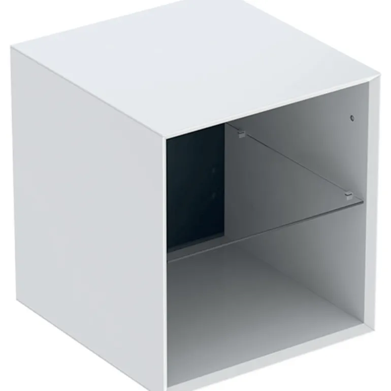 Avoin kuitulevystä valmistettu sivukaappi lasihyllyillä. 450 x 49,20 x 470 mm.