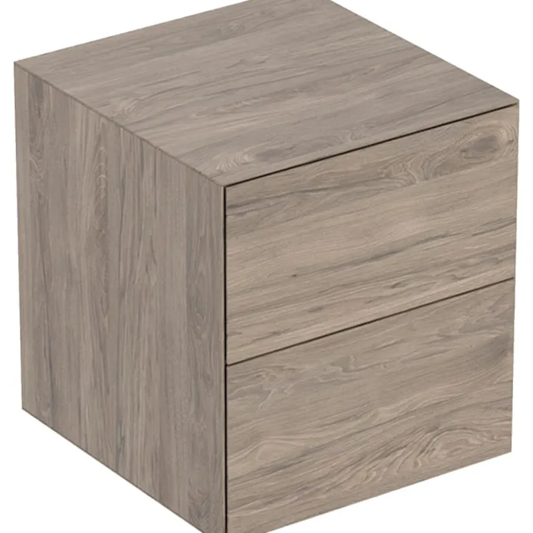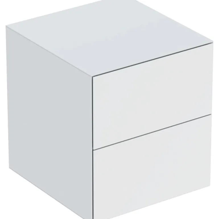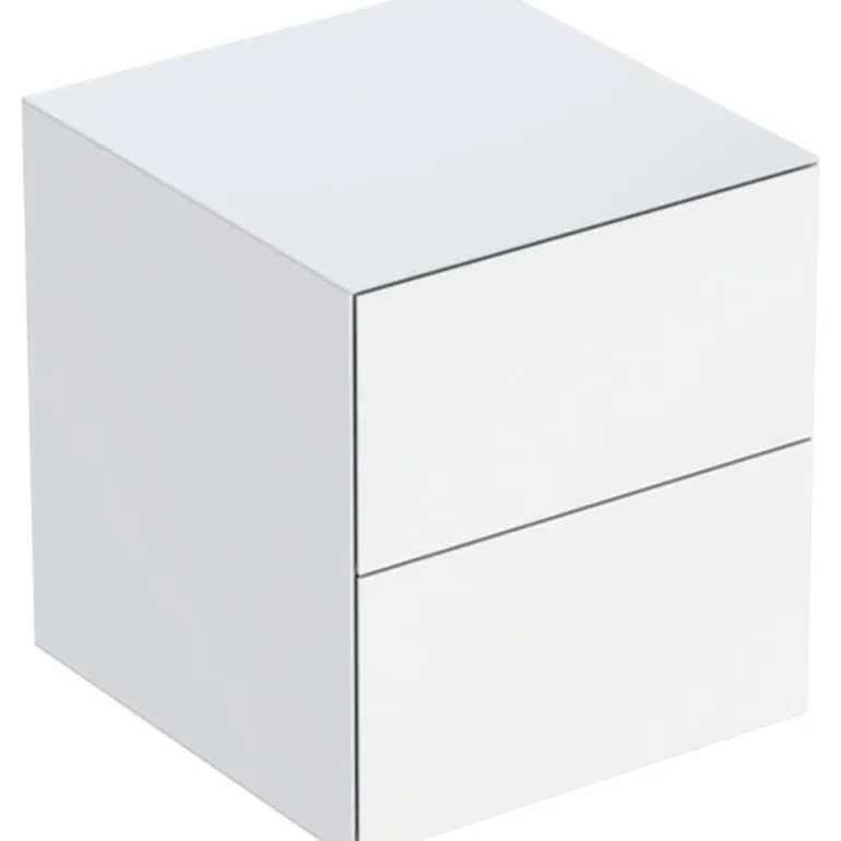 Sivukaappi kahdella laatikolla. Push-to-open-mekanismilla. Materiaalina kuitulevy.