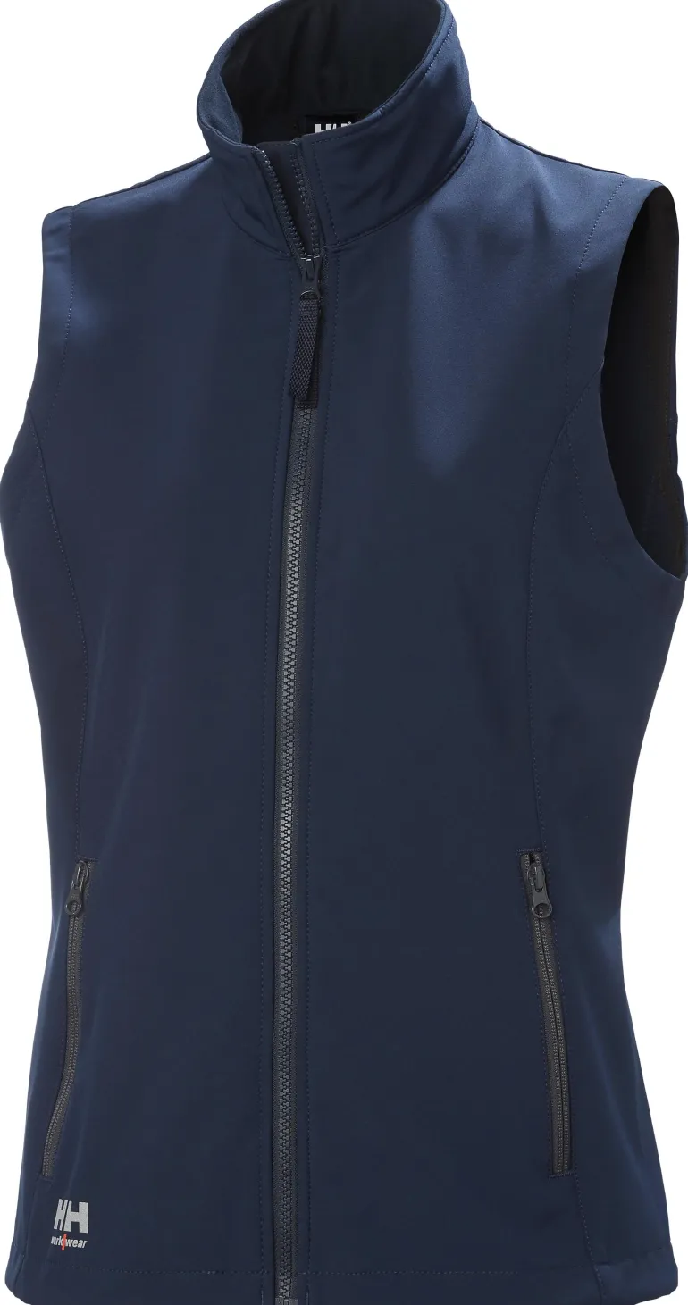 Naisten softshell-liivi kalvolla ja DWR-käsittelyllä. Ilman olkasaumoja hyvää liikkuvuutta ja käyttömukavuutta varten. Harjattua fleeceä kauluksen sisäpuolella.