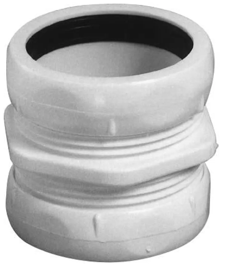 Sovitinliitäntä kiristysrenkailla molemmissa päissä. Koko 50 x 40 mm, valmistettu valkoisesta PP-muovista.