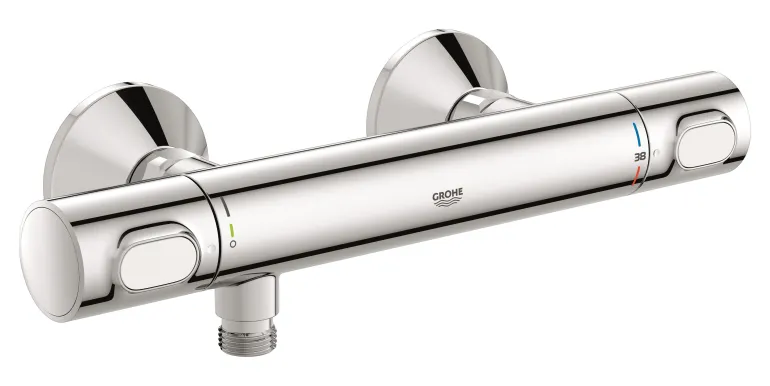 Grohe Precision Flow on termostaattinen suihkuhana seinäasennukseen (150 c/c). Tyylikkäällä Grohe StarLight-kromipinnalla.