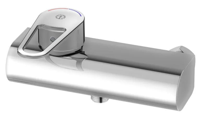 Gustavsberg New Nautic-suihkuhana, jossa on helppokäyttöinen kahva selkeillä värimerkinnöillä kuumalle ja kylmälle vedelle. Kahva on varustettu keraamisella säätöosalla, joka tekee siitä pehmeän ja helpon käsitellä.