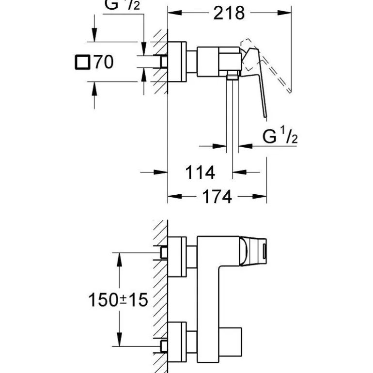 Yksikahvainen sekoitin suihkuun DN 15 -seinäasennuksella. Varustettu metallikahvalla, StarLight -kromipinnalla, säädettävällä virtauksen rajoittimella, suihkuliitännällä 1/2″ (alapuolella) ja sisäänrakennetulla takaiskuventtiilillä.