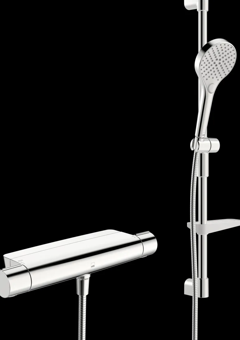 Suihkusetti termostaattihanalla ja käsisuihkulla. Suihkuhanassa on helppokäyttöinen lämmönsäätökahva lämpötilanrajoittimella (turvanuppi 38°C:n kohdalla).