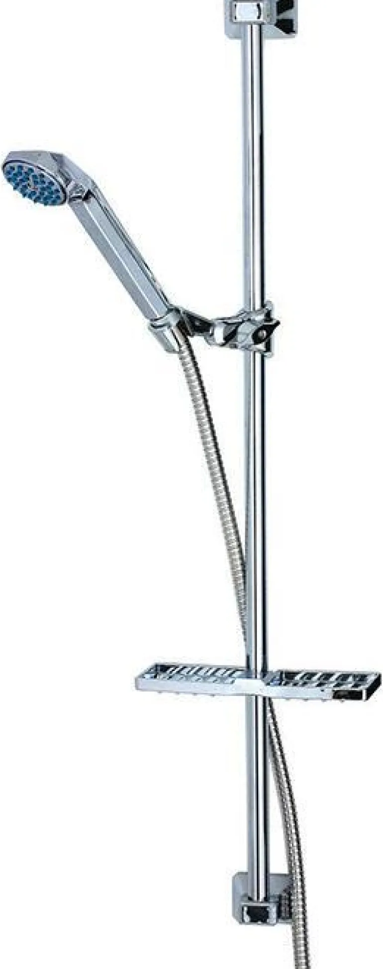 Kokonainen suihkusetti, jossa on käsisuihku, shampoohylly, letku ja 75 cm suihkutanko.