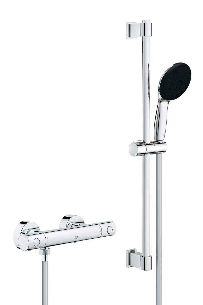Grohe Precision Get -suihkusetti suihkutangolla, käsisuihkulla (yksi suihkutyyppi Rain) ja termostaattisella kromisella suihkuhanalla 1/2″ (DN 15), 150 c/c. Setti sisältää Precision Get termostaattisen suihkuhanan 1/2″ ja Vitalio Start 110 suihkusetin 600 mm suihkutangolla (27 942). Soveltuu ruuvikiinnitykseen (ruuvit ja tulpat sisältyvät toimitukseen) tai asennukseen liimalla (Grohe QuickGlue S 41 247 000 tuote myydään erikseen – 2 x tarvitaan). Suihkutangon kapasiteetti: max. 20 kg. Kapasiteetti koskee staattista (hitaasti lisättyä) kuormitusta ja vain tuotteelle tarkoitettuun käyttöön.