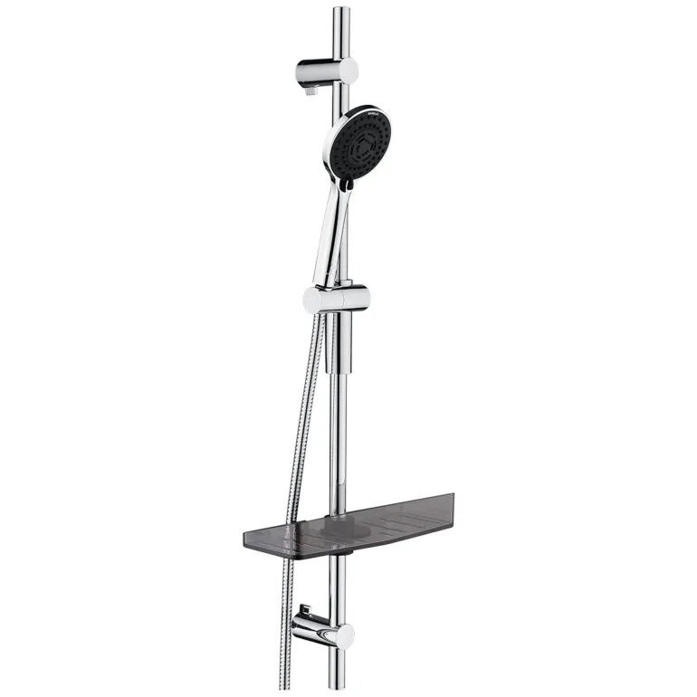 DIVELLO Hydro 3F -suihkusetti, joka koostuu käsisuihkusta 175 cm:n suihkuletkulla (1/2″) ja 90 cm:n suihkutangosta kestävällä saippua- ja shampoohyllyllä (Ø 22 mm).