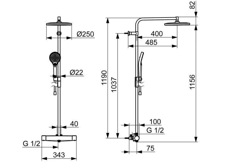 Suihkusetti termostaattisella hanalla sekä ylä- ja käsisuihkulla. Käyttäjäystävällisillä kahvoilla (lämmönsäätökahvassa turvanuppi 38°C:n kohdalla). EcoFlow-virtaamasäädin. Hanassa on roskasiivilät ja yksisuuntaventtiilit. MagShelf -irrotettava hylly magneettikiinnityksellä.