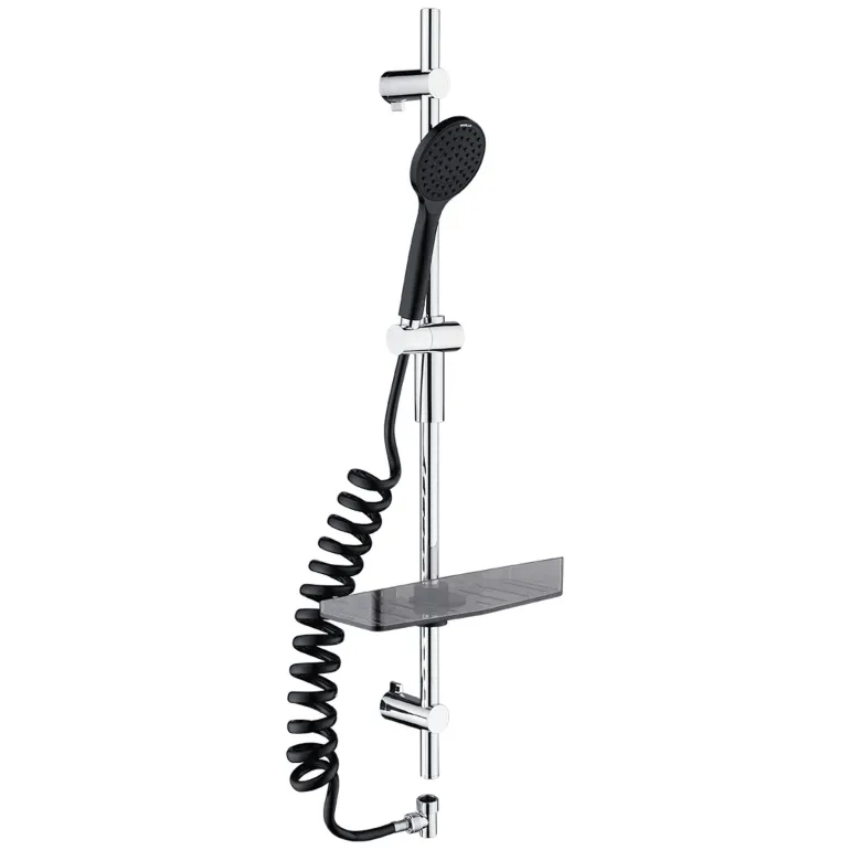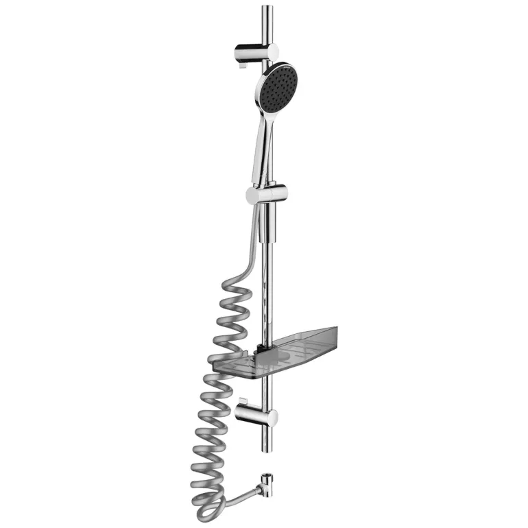 DIVELLO Antibac 1F -suihkusetti, joka koostuu käsisuihkusta 70–270 cm:n suihkuletkulla (1/2″) ja 90 cm:n suihkutangosta kestävällä saippua- ja shampoohyllyllä (Ø 22 mm).