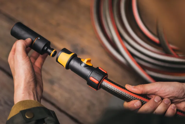 Fiskarsin suihkusuuttimessa on tartuntaystävällinen SoftGrip-kahva ja sileä suihkukuvion säätö.