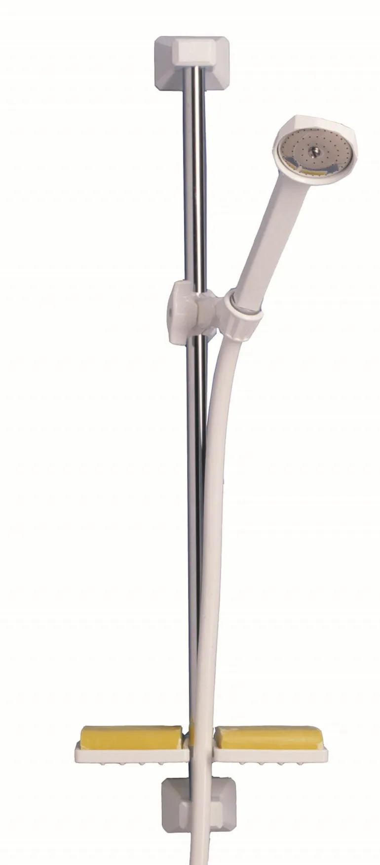 75 cm pitkä seinätanko liu’uilla sekä shampoo- ja saippuahyllyllä. Tangossa on valkoiset seinäkiinnikkeet, ja sen halkaisija on 18 mm. Letku ja suihku eivät sisälly toimitukseen.