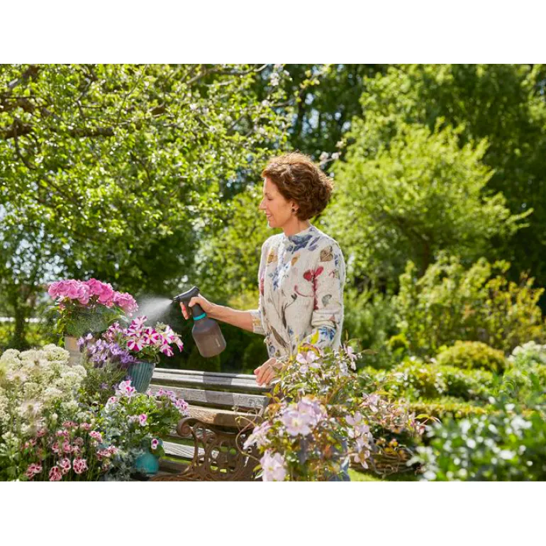 GARDENA 0,75 l sumutinpullo mahdollistaa kukkien ja kasvien sumukastelun kodissa ja puutarhassa. Se tekee vaikutuksen 360-asteen toimintolla, joka varmistaa, että pumppuosaan ei imeydy ilmaa. Kestävä, korkealaatuinen messinkisuutin takaa, että vesisuihku on aina mahdollisimman tehokas. Suutinta on helppo ja kätevä säätää joko suihkuksi tai sumuksi toiveidesi mukaan. Vesimäärä näkyy helposti läpikuultavasta pullosta.