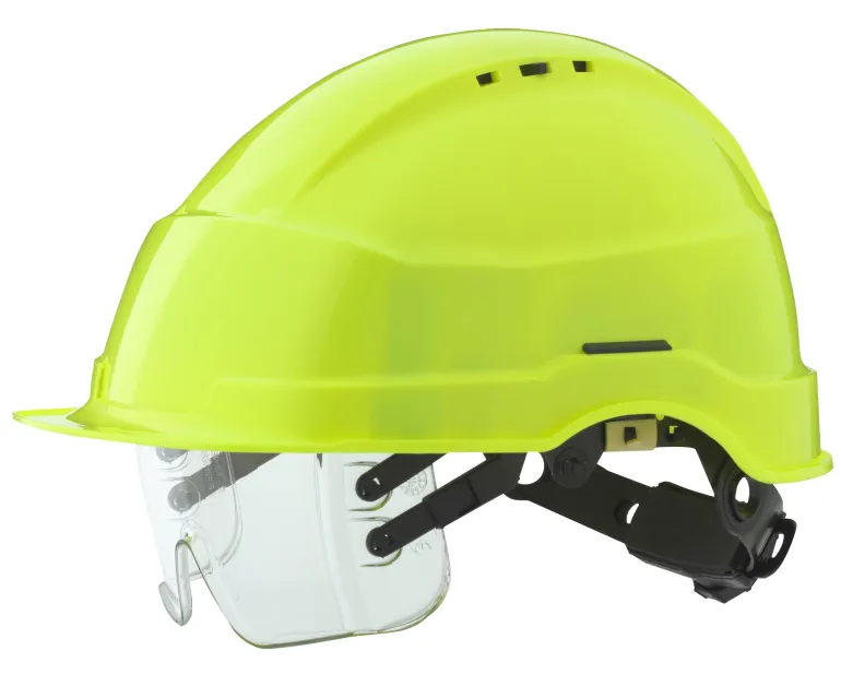 Suojakypärä integroiduilla polykarbonaattisuojalaseilla. Visiirin alla voi käyttää omia silmälaseja. Visiirin voi taittaa kypärän sisään, kun sitä ei käytetä. Ilmanvaihto, 6-pisteinen sisäosa säätöpyörällä, sadekouru, tasainen etuosa, ura kuulonsuojainten kiinnittämiseen. Toimitetaan ilman leukahihnaa.