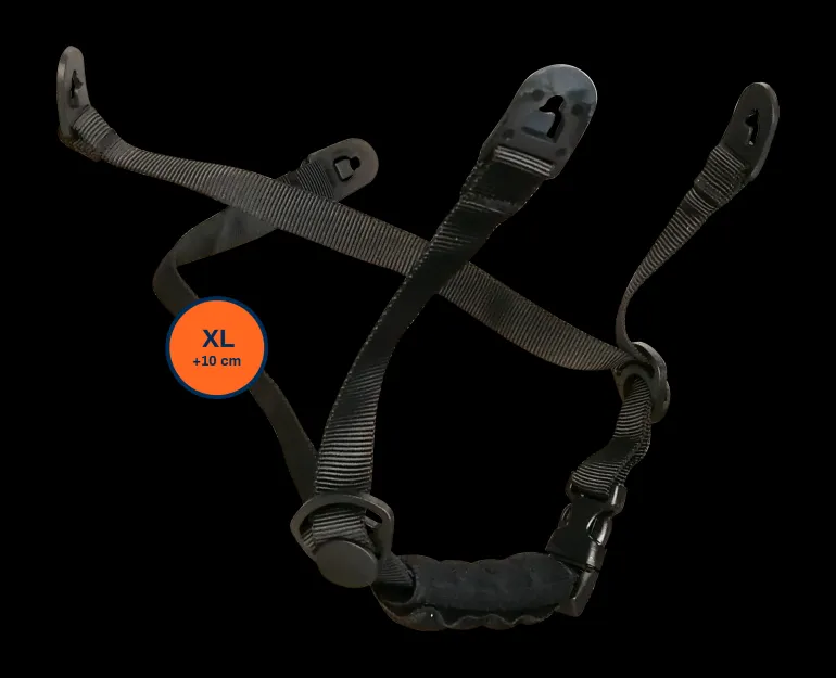 Guardio ARMET -suojakypärän leukahihna (4-pistekiinnitys). Leukahihna on hyväksytty eurooppalaisen standardin EN397 mukaisesti ja suunniteltu avautumaan 25 N:n voimasta. Jos käyttäjän pää jää kiinni vaaratilanteessa tai onnettomuudessa, hän pääsee irti kypärästä. Mukana leukapehmuste, joka lisää käyttömukavuutta pidemmässäkin yhtäjaksoisessa käytössä. XL = + 10 cm.