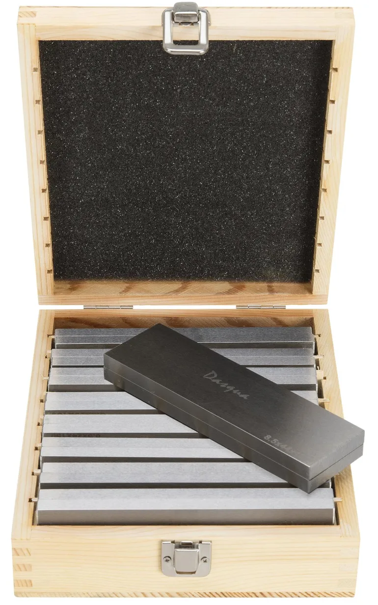 Korkealaatuinen 9-osainen sarja karkaistuja ja hiottuja metrisiä suuntaispaloja. Sisältää 9 paria suuntaispaloja korkeudella: 14, 16, 20, 24, 30, 32, 36, 40 ja 44 mm.