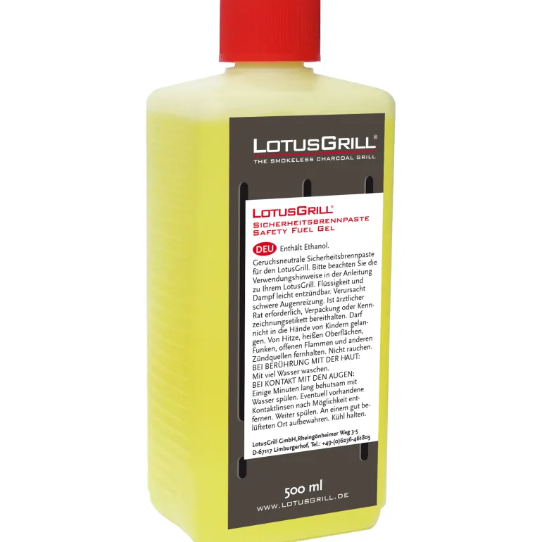 500 ml etanolista valmistettua sytytysgeeliä LotusGrillin sytyttämiseen. Annostele sopiva määrä sytytyslevylle. Säilytetään viileässä ja pimeässä.