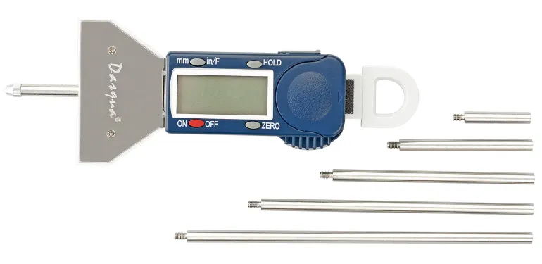 Dasqua 495176 on digitaalinen syvyysmitta isolla ja selkeällä näytöllä. Mittausalue 0-25 mm:in välillä ja tarkkuus 0,01 mm.