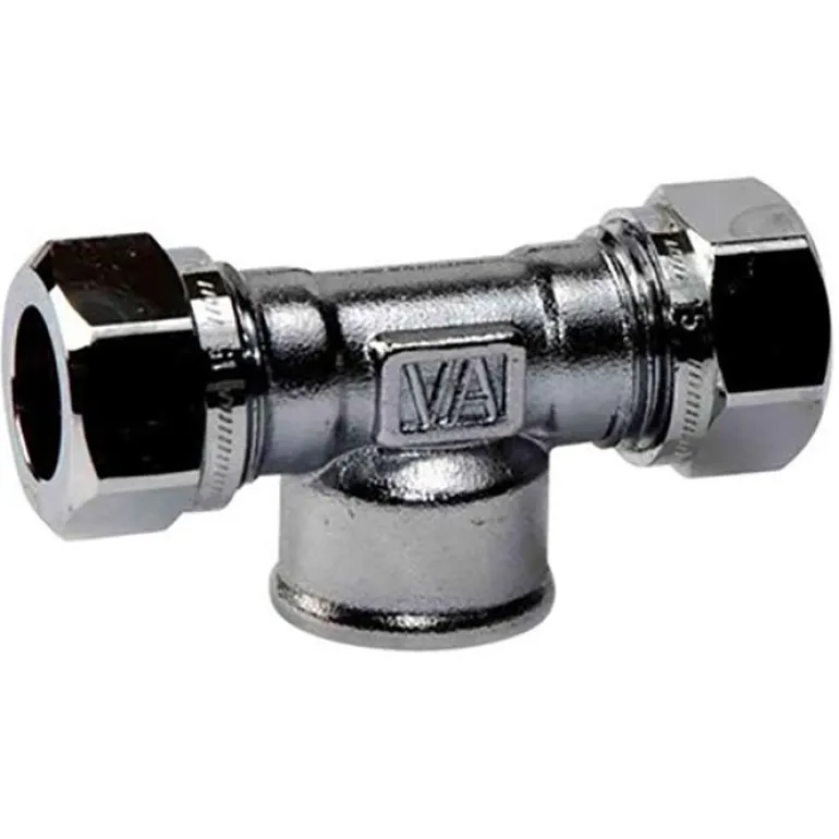 T-liitin, jonka mitat ovat 12 mm, sisäkierre keskellä. Tehty messingistä, kromattu pintasuojaus.