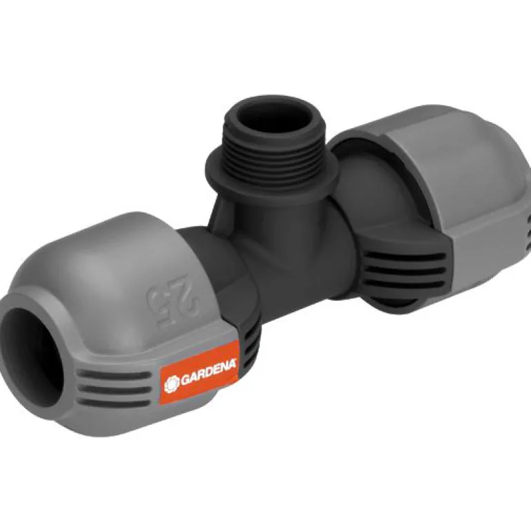 T-liitin, koko 25 mm x 3/4″, uroskierre. GARDENA-sadetinjärjestelmässä T-liitintä käytetään turbiinikäyttöisen T 380 -upposadettimen (8205-29) ja R 140 -keinusadettimen (1537-29) liittämiseen runkoputken päähän.