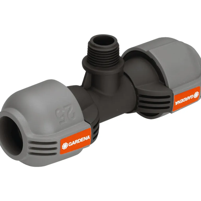 T-liitin, koko 25 mm x 1/2″, uroskierre. GARDENA-sadetinjärjestelmässä T-liitintä käytetään S 80 -upposadettimen (tuotenumero 1569-26) ja turbiinikäyttöisten T 100- ja T 200 -upposadettimien (tuotenumerot 8201-29 and 8203-29) liittämiseen runkoputkeen.