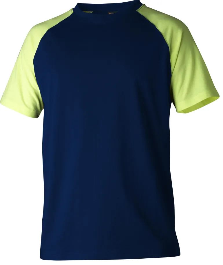 Musta/keltainen T-paita, jossa on näkyvyyttä parantavia yksityiskohtia ja pyöreä kaula-aukko. 65 % polyesteriä ja 35 % puuvillaa.