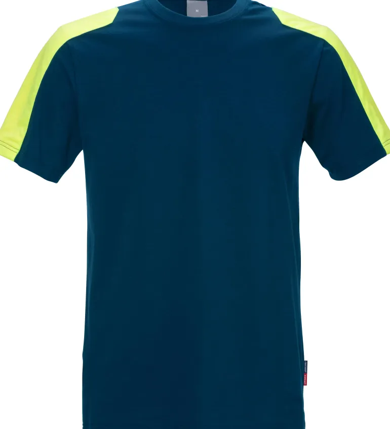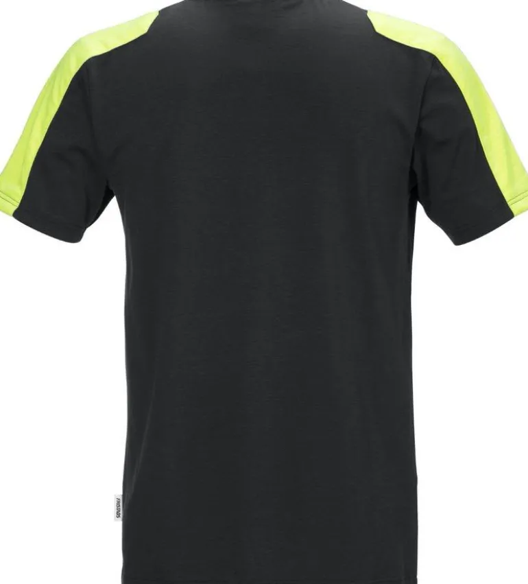 Joustavasta materiaalista valmistettu Öko-Tex-sertifioitu t-paita, jossa on joustava pääntie ja kontrastiväriset ompeleet. Olkapäiden ja käsivarsien keltaiset osat parantavat näkyvyyttä.