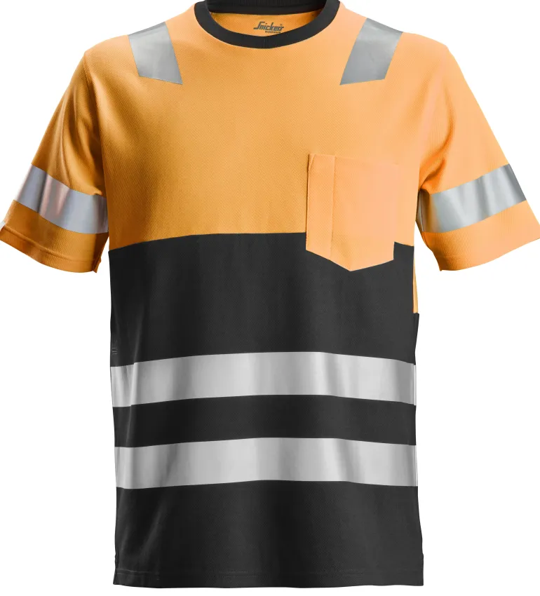 Snickers 2534 AllroundWork on lyhythihainen puuvillainen huomio-t-paita, jonka mukava puuvillapinta sisäpuolella takaa optimaalisen käyttömukavuuden. Joustavat painetut heijastinnauhat ulkopuolella, luokan 1 näkyvyys.