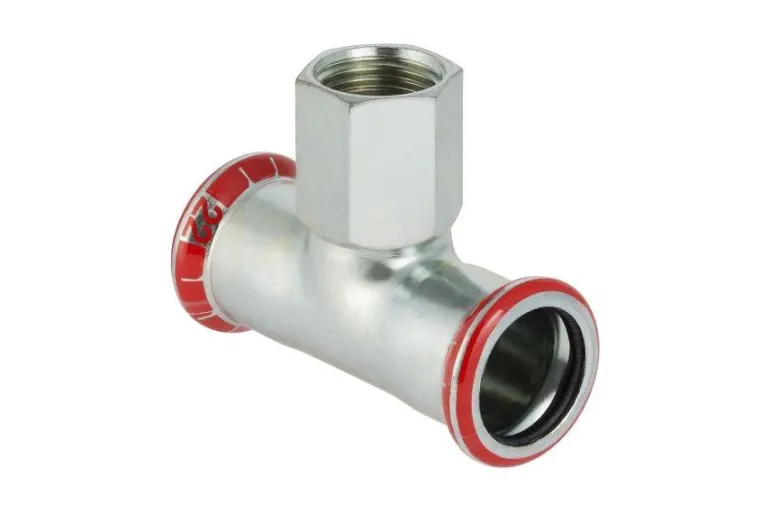 T-putki sisäkierteellä ja 2 x puristusmuhvi. Putki on sähkösinkittyä terästä.