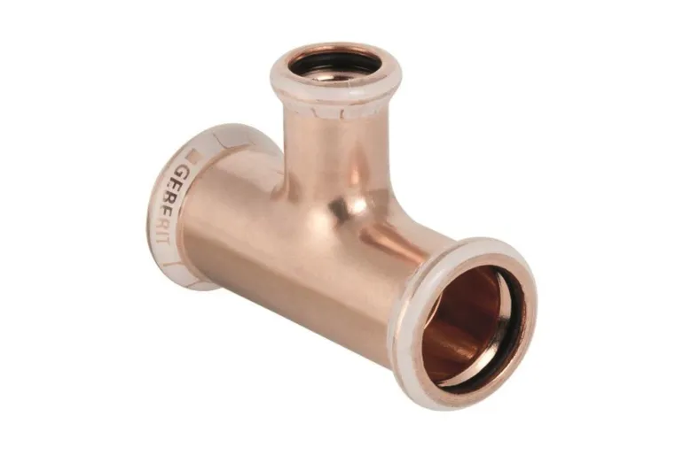 T-putki, jossa on supistettu haara. Valmistettu kuparista, 3 x puristusmuhvi.