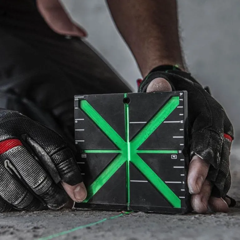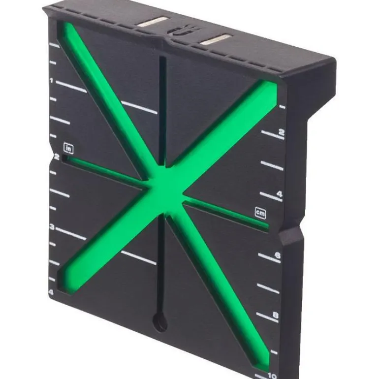 Responsiivinen laserin tähyslevy käytettäväksi vihreän laserin kanssa, joka yksinkertaistaa ja nopeuttaa linjausta pitkällä matkalla. Levyssä on suurikontrastinen heijastava pinta ja laaja magneettinen pohja, joten sitä käytetään lattioissa ja kiinnitetään teräsrakenteisiin. X-muotoilu antaa käyttäjälle reagoivaa palautetta, joka ohjaa käyttäjää kohti kortin keskustaa, mikä helpottaa asennusta.