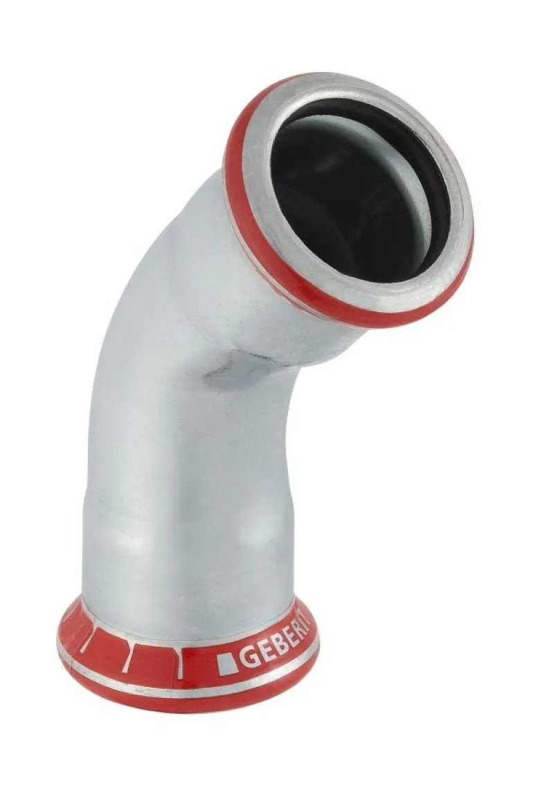 Geberit 1550939 on taivutettu putki, jossa on 45° taivutuskulma. Putkessa on 2 x puristusholkkiliitäntä ja puristusprofiili M.