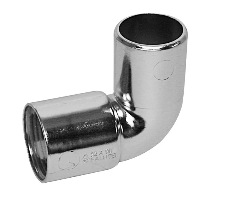 Kromattu taivutettu putki 32 mm x 90°, holkilla ja sileällä päällä, pistoliitettäväksi sisäviemäriin. Sisältyy valkoisella tiivisteellä varustettuun FaluVULK-järjestelmään.
