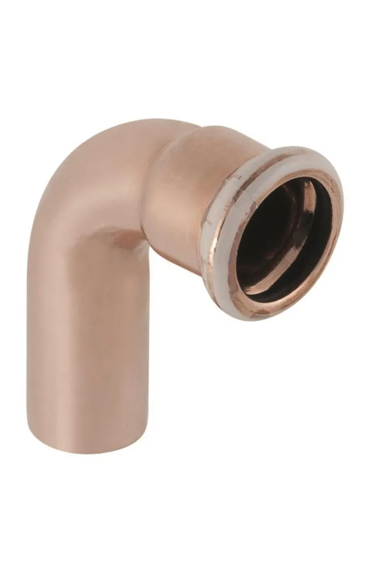Taivutettu putki puristusholkilla ja sileällä päällä sekä 90° taivutuskulmalla. Malli on valmistettu kuparista.