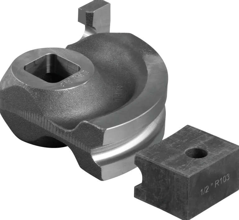 Taivutussegmentti ja liukukappale valurautaa, 90°, malliin REMS Curvo 50. Taivutussegmenttien ja liukukappaleiden optimaalinen sovitus takaa materiaalin mukaisen liukumisen ilman halkeilua tai taittumista. Kulma-asteikko jokaisessa taivutussegmentissä ja merkintä jokaisessa liukukappaleessa mittatarkkaa taivutusta varten. Taivutussegmentin ja liukukappaleen nopea vaihto.