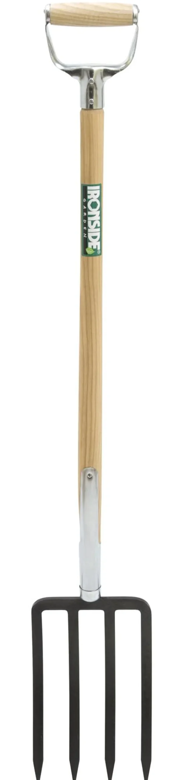 Täystaottu 4 piikkinen. Öljykäsitelty saarnipuusta valmistettu varsi. Kahva teräs-puu. 190x315mm. Kokonaispituus 1300mm.