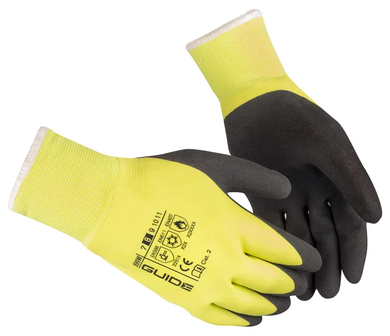 Guide Gloves 590W on talvivuorillinen, täyspinnoitettu käsine kaksoispinnoitetulla kämmenellä. Lateksipinnoitteen ansiosta käsine säilyttää joustavuutensa myös matalammissa lämpötiloissa. Karhennettu, eristävä akryyli kämmenessä. Kosketuslämmön kestävyys, taso 2.