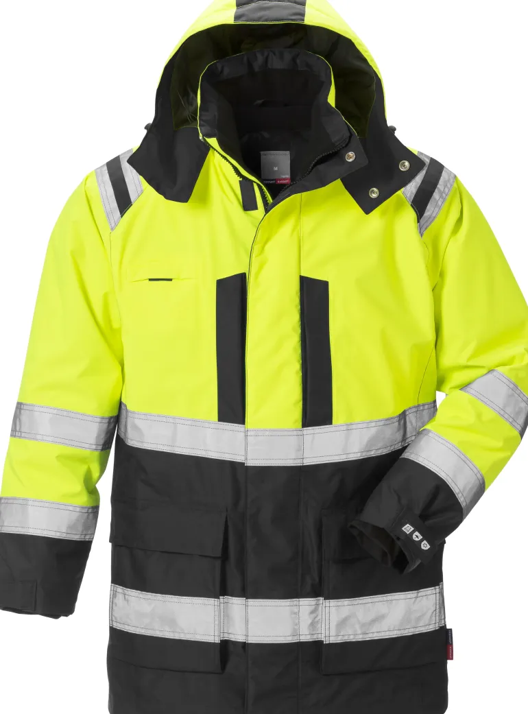 Talvitakki veden- ja tuulenpitävästä Airtech-materiaalista. Hengittävä. Irrotettavan tikkivuoren ansiosta takkia voidaan käyttää myös kuoritakkina. Talvitakissa on irrotettava ja säädettävä huppu, säädettävät hihansuut ja fleecevuorillinen kaulus. Takki on Öko-Tex-sertifioitu ja hyväksytty standardien EN ISO 20471 luokan 3, EN 343 luokan 3/3 ja EN 342 mukaisesti. Se on testattu teollisen pesustandardin ISO 15797 mukaisesti.