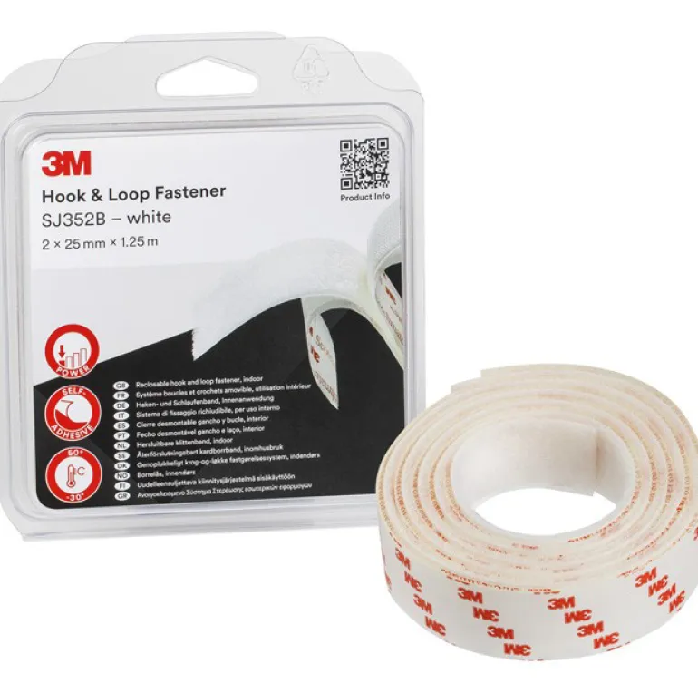 3M Hook & Loop SJ352B on 4,4 mm tarranauha. Kudottu nailonnauha kestää tuhansia avauksia ja siinä on kumiliima ja valkoinen polypropeenikalvo. Kiinnittyy tiiviisti erilaisia pintoja vastaan, mukaan lukien monet matalaenergiamuovit ja jauhemaalaukset.