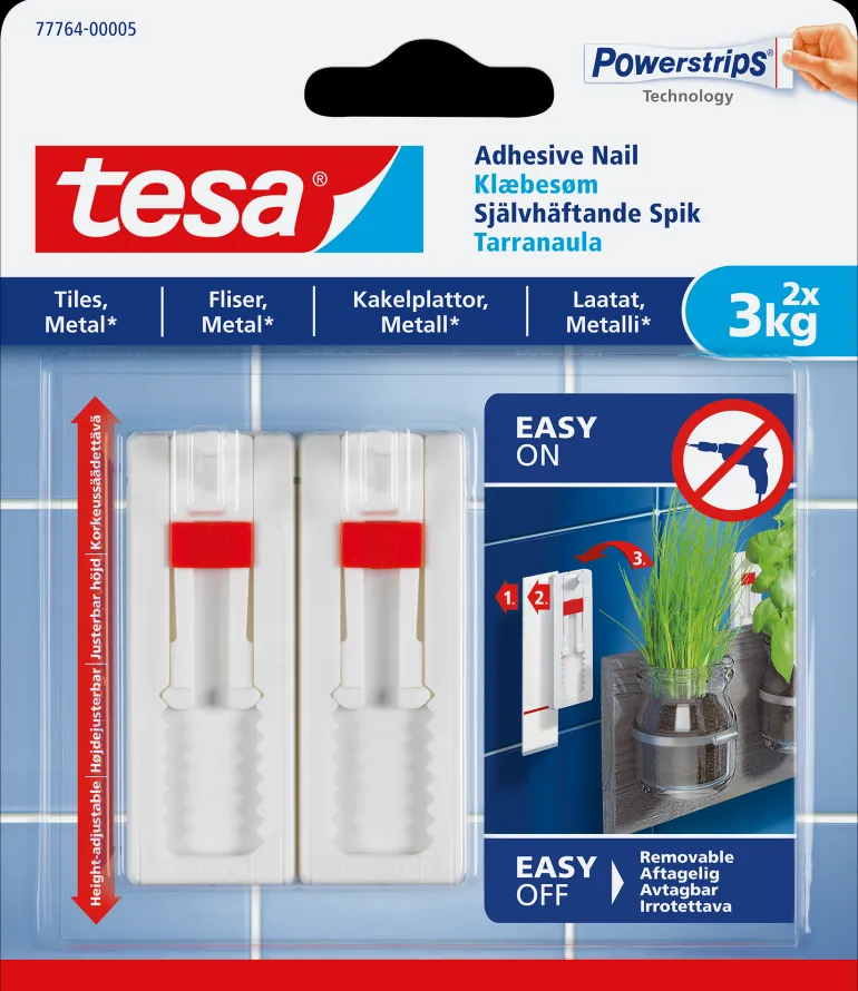 Korkeussäädettävä tarranaula korkeintaan 3 kg painaville esineille. Täydellinen esimerkiksi keittiötarvikkeiden ripustamiseen ja kohdistamiseen sileille ja koville pinnoille, kuten laatat ja metalli. Ne tarjoavat varman kiinnityksen sileille ja kiinteille pinnoille (laatta- ja metallipinnat). Innovatiivinen korkeussäätö tekee ne erityisen sopiviksi esineiden pystysuuntaiseen kohdistamiseen tai kahden tarranaulan käyttöön yhdelle esineelle. Helppo ja mukava kiinnitys ilman pintojen vahingoittamista ja sählinkiä vasaran tai poran kanssa. Powerstrips®-teknologian ansiosta tarranaula on irrotettavissa jälkiä jättämättä ja on uudelleen käytettävissä uudella tesa®-tarraliuskalla.