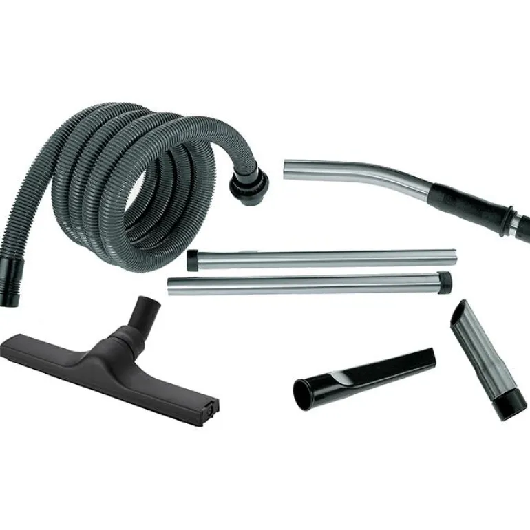 Tarvikesarja, johon sisältyy 4 m pitkä pölynimuriletku Ø 36 mm, teräksinen putken mutkakappale, 2-osainen teräksinen pölynimuriputki 2 x 505 mm, muovinen lattiasuulake 360 mm, muovinen saumasuukappale 300 mm ja vino suukappale. Sisältö: 4 m:n imuletku Ø 36 mm Putken mutkakappalePölynimuriputkiLattiasuutinSaumasuulake Vino suukappale