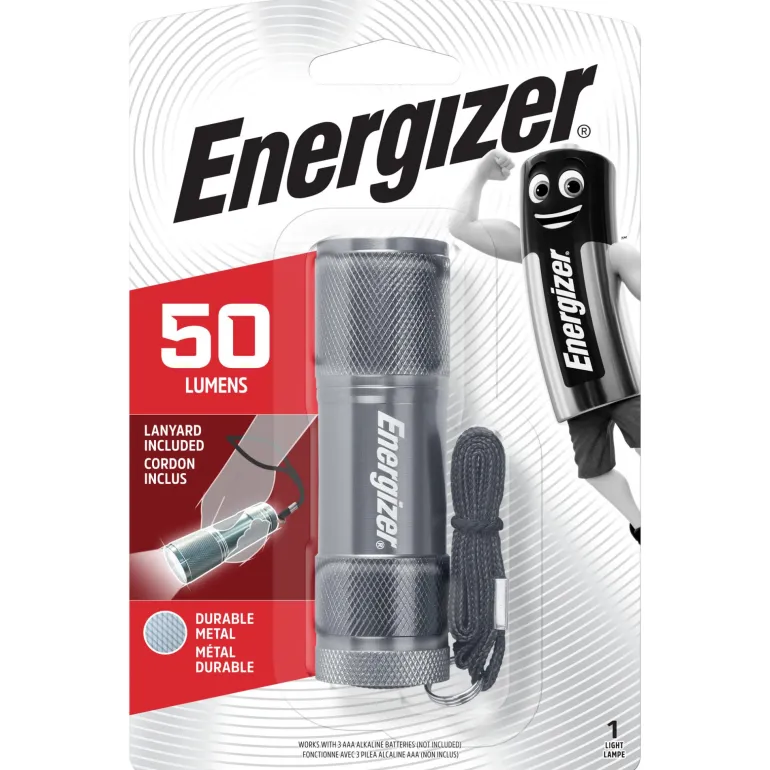 Energizer Metal on musta kompakti 50 lm taskulamppu, jonka valokeilan pituus on 16 m, kestävässä metallikotelossa, jossa rihlaus takaa hyvän pidon. Lamppu saa virtansa 3 kpl AAA-paristosta (ei sisälly toimitukseen) ja sen toiminta-aika on 10 tuntia.