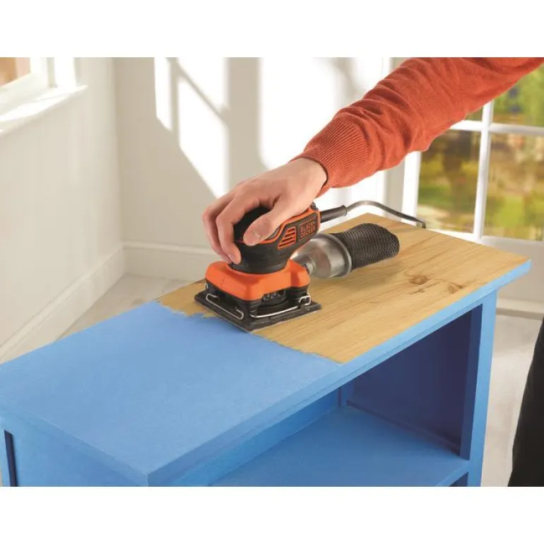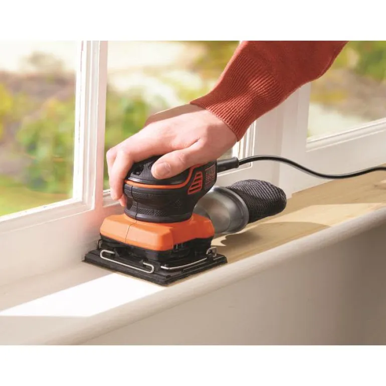 Black & Decker KA450-QS on kompakti 220 W tasohiomakone 114×114 mm paperikoolla ja 16000 kierr./min nopeudella. Varustettu tehokkaalla pölynpoistojärjestelmällä, kahvavirtakytkimellä ja suurella piiripinnalla. Ihanteellinen suurten tasaisten pintojen, kuten ovien ja pöytien, hiontaan. Voidaan käyttää myös maalin, lakkojen ja muiden pintakäsittelyiden hiontaan.
