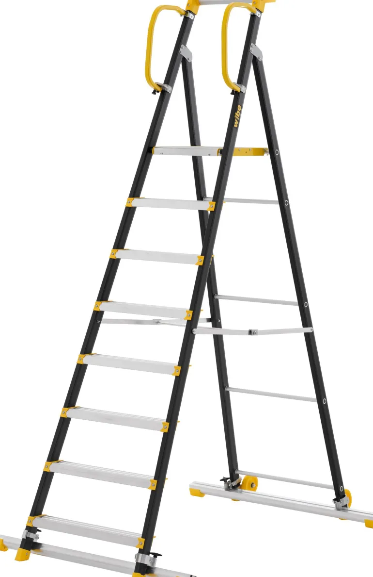 Tukevat, vakaat ja kestävät tasotikkaat jokapäiväiseen ammattikäyttöön. Erittäin suuri metallitaso (400 x 400 mm) karkealla kaksisuuntaisella liukastumissuojalla, joka antaa sinulle runsaasti tilaa liikkua ergonomisesti ja tehokkaasti työssäsi. Kaide kolmella sivulla tarjoaa turvallisen työtilan putoamissuojalla – tikkaat ovat kokoontaitettavat kuljetuksen helpottamiseksi. Isolla metallihyllyllä on runsaasti tilaa työkaluille ja materiaaleille, jotta voit työskennellä kädet vapaina. Yhdistetyt alumiinituet, jotta voit katsoa molemmille puolille yhdellä kädellä kiinni pitäen. FDS-ruuveilla toteutettu innovatiivinen kiinnitysteknologia tarjoaa vakaan rakenteen minimaalisella joustolla ja todella pitkällä käyttöiällä. Kuljetuksen helpottamiseksi 6- ja 8-askelmaisissa malleissa on pyörät tukipuolella. ”Bra arbetsmiljöval” -hyväksytty, hyvä valinta turvallisempaan työskentelyyn, 2 metriin asti (taso 3). Valmistettu sertifioidusta alumiinista, joka on valmistettu uusiutuvista energialähteistä, mikä pienentää hiilijalanjälkeä merkittävästi.