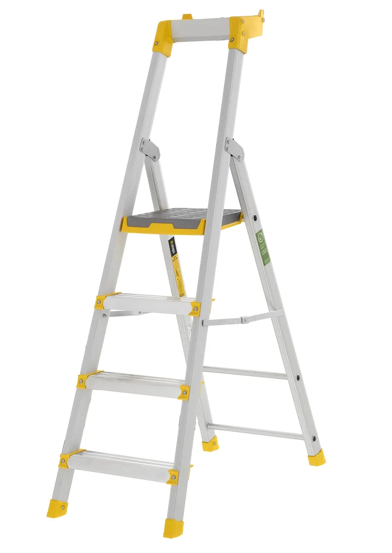 Tukevat tasotikkaat anodisoiduilla ja tummumattomilla sivutuilla. Hiljainen metallinen työtaso, jossa on kaksisuuntainen liukuestepinta. Ergonomiset askelmien etuosat, joita vasten voi nojata. 3-, 4- ja 5-askelmaisilla malleilla on Hyvä työympäristö -säädöksen mukainen hyväksyntä.