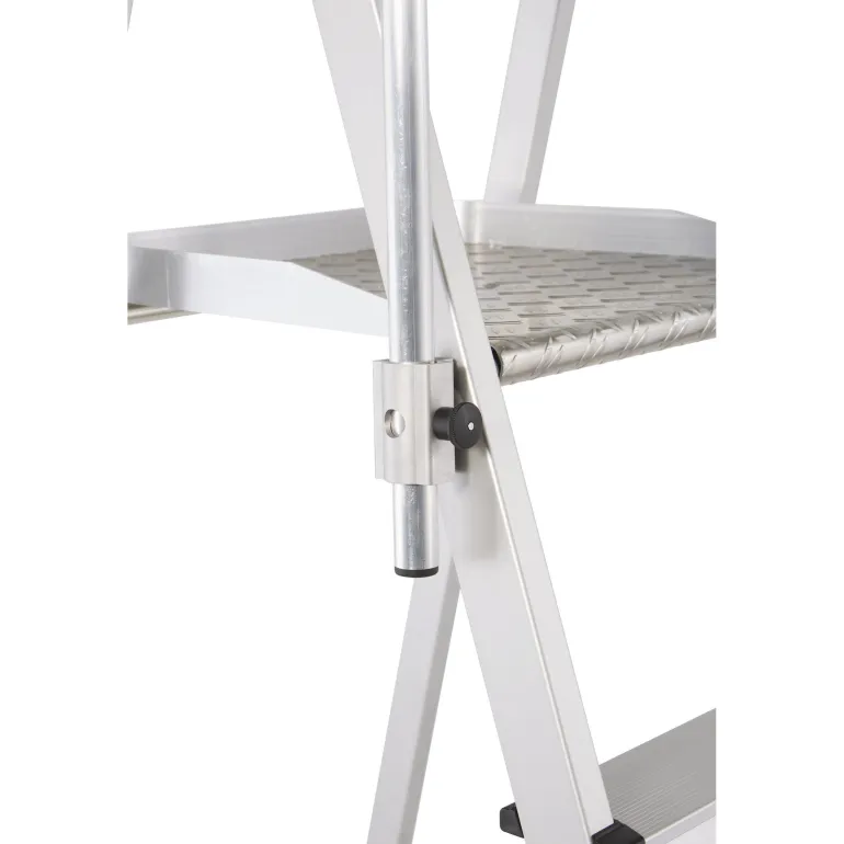 Erittäin kevyet tasotikkaat: Kevyt ja käytännöllinen kokoontaitettavien kaiteiden ansiosta. Suuri työtaso (400 x 400 mm) takaa hyvän käyttömukavuuden. Työturvallisuutta parantava kaide kolmella puolella. Kaiteen korkeus 1 000 mm. Taittuva kahva säästää tilaa kuljetuksen yhteydessä. 80 mm syvien, uritettujen portaiden ansiosta tillailla seisominen on mukavaa ja turvallista. Kolminkertaiset niitatut liitokset sivutukien ja askelmien välissä. Anodisoitua alumiinia.