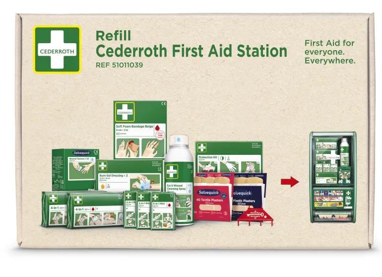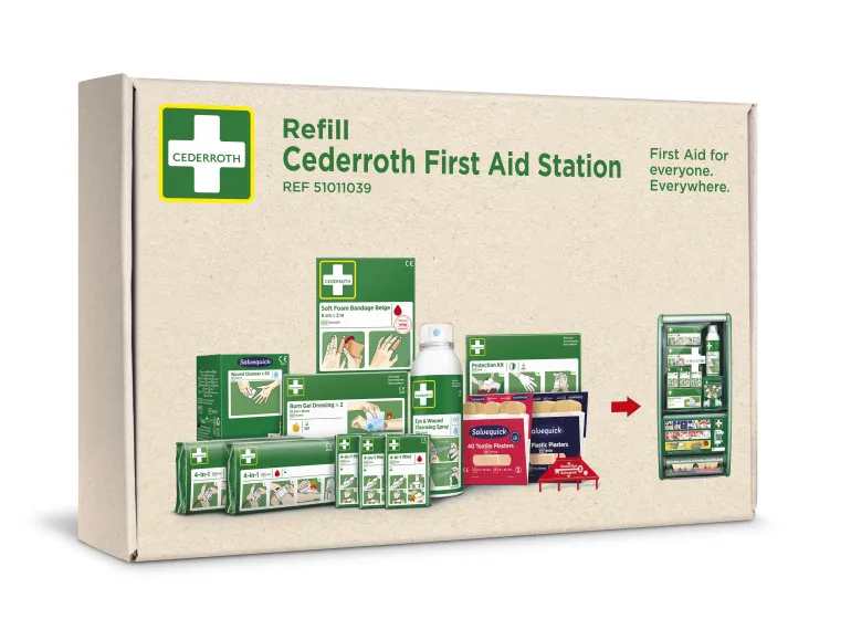 Cederroth 51011039 on täydennyspakkaus Cederroth Ensiapuasemaa (51011026) varten. Pakkaus sisältää kokonaisen täydennyssarjan ensiapuasemaan ja on päivitetty Soft Foam Bandage Beige-tuotteella (6 cm x 2 m).