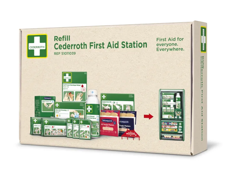 Täyttöpakkaus Cederroth Ensiapuasemaa (51011026) varten. Pakkaus sisältää kokonaisen täydennyssarjan ensiapuasemaan ja on päivitetty Soft Foam Bandage Beige-tuotteella (6 cm x 2 m).
