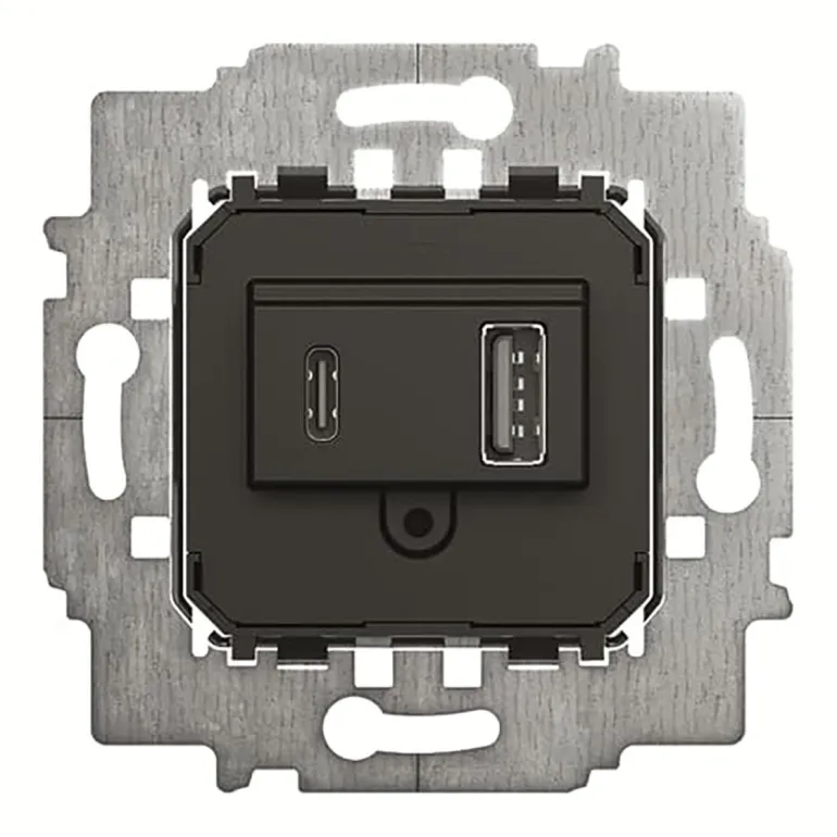 Kojerasiaan asennettava USB-virtalähde/latausasema. Kojeessa on USB A- ja USB C-liittimet. Laite tukee kahden laitteen yhtäaikaista lataamista ja optimoi lataustehoa mahdollisimman lyhyen latausajan saavuttamiseksi.